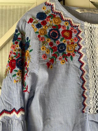 Blusa de Zara con un diseño muy especial y llamativo. - Mangas acampanadas. - Bordados florales en la parte superior. - Detalle de encaje en el escote. - Rayas finas verticales.