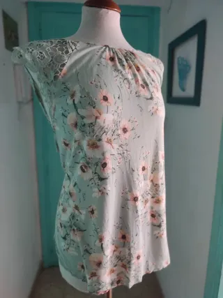 Blusa de la marca H&M con encajes en los hombros y tejido muy fluido Color verde pastel y flores beige