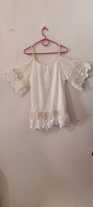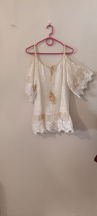 Blusa de encaje con hombros descubiertos y mangas amplias, transparentes y ligeras. (Precio negociable)
