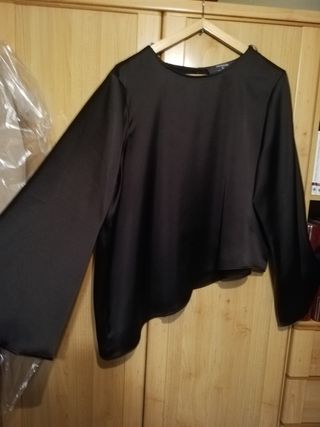 Blusa de manga acampanada, en tejido poliester aspecto raso, tono chocolate, faldón irregular hacia un lateral. A estrenar, conserva etiqueta. Precio nueva en Primark 16 euros. Talla XL
