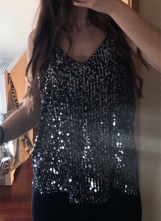 Blusa de tirantes con un acabado brillante, ideal para ocasiones festivas. - Diseño con escote en V. - Tejido con destellos plateados. - por debajo tiene forro negro, tipo gasa.