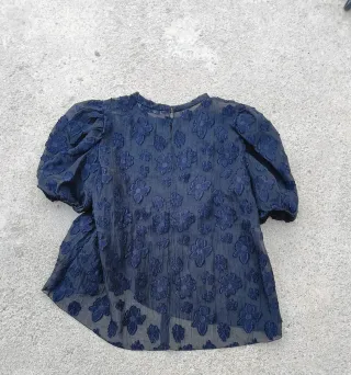 Elegante blusa negra con un diseño moderno y detalles que la hacen perfecta para ocasiones especiales. Su tejido ligero y el detalle de la manga le dan un toque sofisticado. Se aceptan ofertas razonables. - Manga larga abullonada. - Tejido con textura de topos. - Cuello redondo.