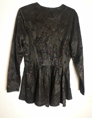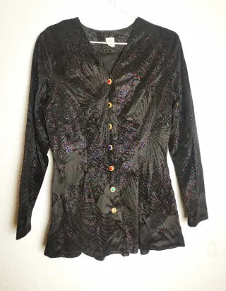 Blusa de fiesta, con corpiño en tela negra imitación terciopelo con estampado brillante, y con la parte superior y las mangas en negro transparente. Tiene cremallera lateral y cierre de botón en la parte de atrás del cuello. El corpiño termina en forma recta por la espalda y en forma de V por delante. Lo hizo una modista, por lo que no hay otro igual. El estampado brillante no se suelta aunque lo laves. Las medidas son: Hombros : 42 cm Cintura: 82 cm Pecho: 92 cm Largo de mamga: 53 cm Largo por detrás: 50 cm Largo por delante varía por la V: 50-54 cm