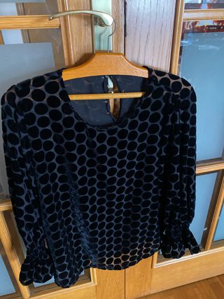 Elegante blusa negra con un diseño de topos aterciopelados, ideal para éstas Fiestas. - Manga larga con puño fruncido. - Cuello redondo. - Cierre de lágrima en la espalda.