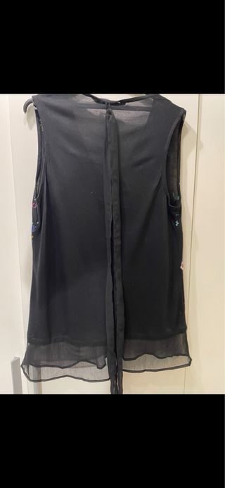 Preciosa blusa sin mangas de la marca Desigual, talla XS. Es una prenda alegre y vistosa, ideal para primavera-verano. - Diseño estampado con motivos florales y paisley. - Confeccionada en una tela ligera y vaporosa. - Corte favorecedor.