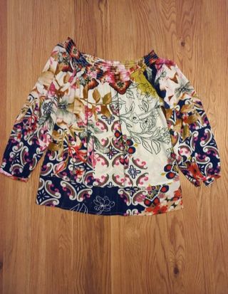 Blusa estampada de Desigual. Pequeños detalles de hilos brillantes. Cuello barco con elástico para colocarlo también tipo bardot, con los hombros al aire. Manga larga tipo tres cuartos. Talla M. Nombre de la marca bordado en la espalda. Etiquetas cortadas salvo la de la talla de la foto. Material: viscosa.