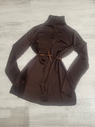 Preciosa blusa de la marca Superstar en color marrón y talla M (38/10). Es una prenda elegante y delicada. - Tiene un diseño con delicadas cadenitas doradas en el escote. - Manga larga. - Cierre con botones. - Tejido ligero y transparente.