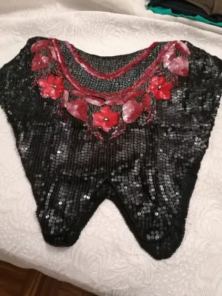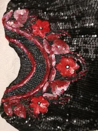 Elegante blusa con lentejuelas y detalles florales. - Diseño con lentejuelas brillantes. - Adornos florales en tonos rojos y rosados. - Cuello adornado con cuentas.