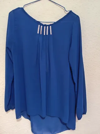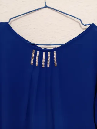 Elegante blusa azul para mujer con un detalle de pedrería en el escote. Talla 44 - Diseño con cuello redondo. - Adorno de brillantes en la parte delantera. - Corte holgado y favorecedor. MUY NUEVA USADA UNAS HORAS MUY ELEGANTE Se entrega en persona Visita mi página para ver otras ofertas