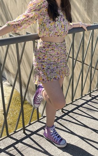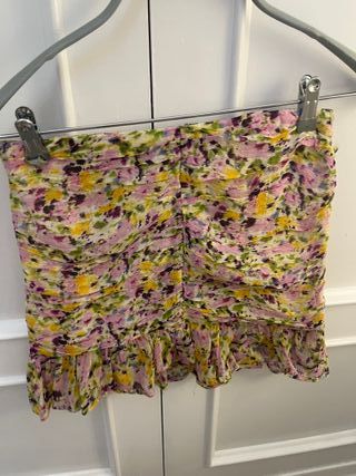 Precioso Conjunto de elegante falda y blusa de la marca Brownie. Para cualquier ocasión. -Bonito Diseño floral y colorido vibrante. con finos hilos dorados - Falda Plisada - Blusa con mangas abullonadas. Talla: XXS