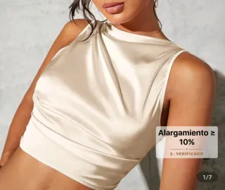Elegante blusa beige con un diseño drapeado y acabado satinado. - Tejido satinado brillante. - Diseño drapeado asimétrico. - Corte crop top.