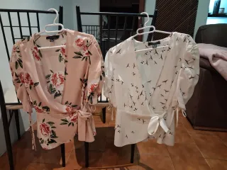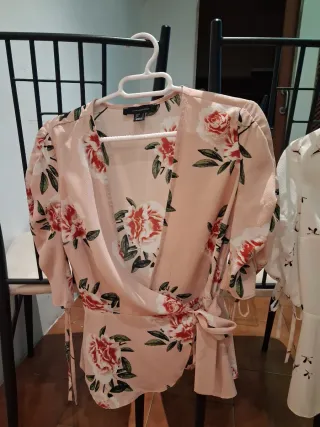 Elegante blusa de seda con estampado floral y cinturón. - Se cierra adelante y se ata a un lado con el lazo que hace de cinturón. - Diseño cruzado. - Mangas largas abullonadas. Queda muy bonita puesta. Talla pequeña (equivale a una XS). Medidas aproximadas en las fotos.