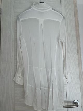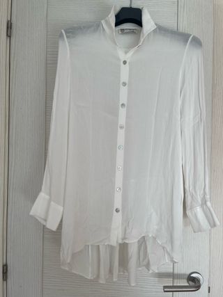 Elegante camisa larga de gasa. - Diseño de cuello alto. - Cierre de botones. - Mangas largas con puños. - Bajo asimétrico con volantes.