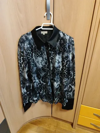 Elegante blusa con un llamativo estampado. - Diseño de leopardo en tonos grises y negros. - Cuello tipo solapa con acabado satinado. - Manga larga.