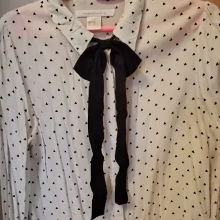 Elegante blusa blanca con un diseño de pequeños triángulos negros. Talla 38. - Cuello con chalina negra. - Manga larga. - Estampado de triángulos negros.
