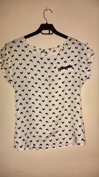 Blusa con un diseño moderno y elegante. - Estampado de flechas en color negro sobre fondo blanco. - Detalle de bolsillo con cremallera en el pecho. - Mangas cortas. - Cuello redondo.