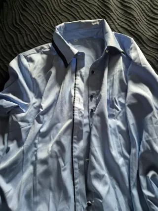 Elegante blusa de manga larga con un diseño moderno. - Cuello camisero. - Botones frontales negros. - Ribete negro en el cuello y la tapeta.