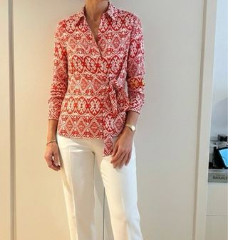 Preciosa blusa de la marca Dandara, en color rojo. Es una prenda elegante y vistosa, ideal para cualquier ocasión. - Diseño de estampado llamativo. - Cierre de botones. - Cinturón a juego. es una talla S de Dandara, que equivale a una M de Zara. Chapita dorada con la marca en la espalda