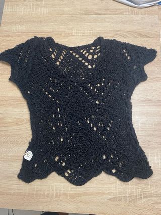 Elegante blusa de tejido calado con un diseño intrincado. Perfecta para añadir un toque especial a tu atuendo. - Diseño de punto calado. - Escote en V. - Manga corta. - Bajo con ondas.