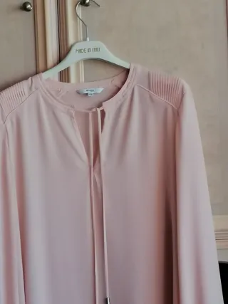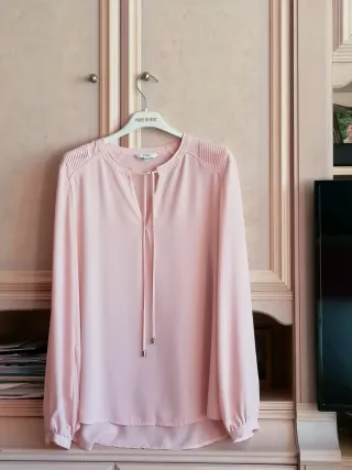 Elegante blusa de vestir en tono rosa palo. Confeccionada en un tejido ligero y con un diseño moderno.Aunque pone Talla 42 equivale a una 38 o 40 - Detalle de pliegues en los hombros. - Escote en V con cordones y terminales metálicos. - Manga larga.