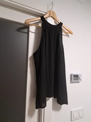 Elegante blusa negra con cuello halter. - Diseño moderno y favorecedor. - Tejido ligero y vaporoso. - Espalda de encaje