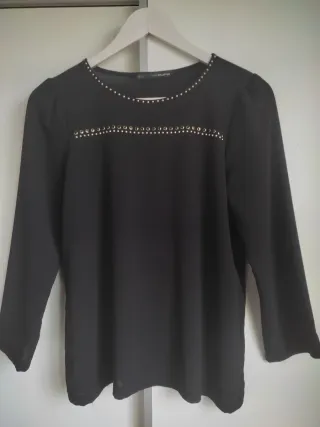 Elegante blusa negra con detalles de tachuelas doradas. - Cuello redondo. - Manga larga. - Adorno de tachuelas en el escote y en el pecho.