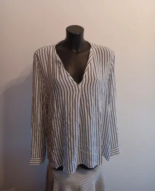 Blusa elegante con un diseño de rayas verticales. - Cuello en V pronunciado. - Mangas largas. - Tejido ligero y fluido.