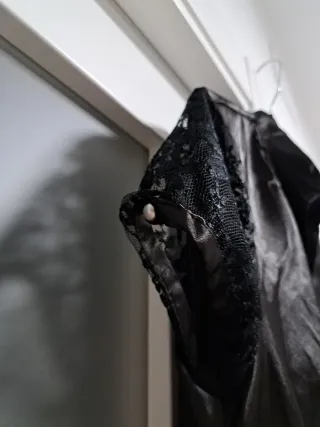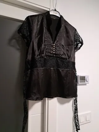 Elegante blusa negra con detalles de encaje. - Manga corta de encaje. - Cuello mao con botones. - Cintura con banda de encaje. - Lazos de encaje en los laterales.
