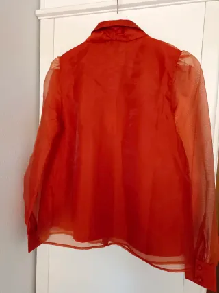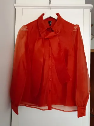 Elegante blusa de VERO MODA en color teja. Talla M, comprada en El Corte Inglés. - Diseño con lazada frontal. - Mangas abullonadas. - Tejido semitransparente.