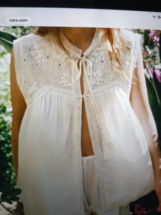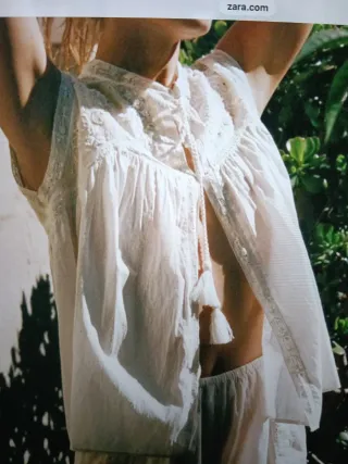 Elegante blusa Zara edición limitada algodón cuello subido y manga sisa detalle de puntilla y bordados aplicación de abalorios con un diseño delicado talla s amplia - Cuello con cordones y borlas. - Mangas cortas. - Tejido ligero y transpirable.