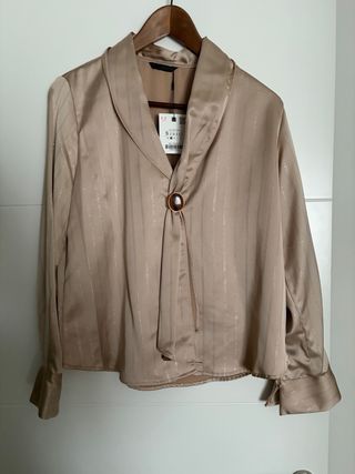 Elegante blusa de Zara con un diseño sofisticado. - Tejido satinado con finas rayas metalizadas. - Cuello drapeado con detalle de broche. - Mangas largas con puños. - Cierre oculto. Sin estrenar. precio original 35€.