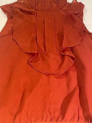 Blusa sin mangas estilo romántico y fluido en tono teja, ideal para un look de oficina sofisticado o uno casual elegante. Volante decorativo en forma de "U" o cascada que adorna la parte frontal, aportando volumen y movimiento al diseño. El cuello es tipo perkins o alto, con un acabado fruncido (tipo nido de abeja) que le da un aire elegante y sofisticado. Bajo el cuello, sutiles pliegues verticales que ayudan a que la prenda caiga de forma fluida. Es muy versátil: con pantalones sastre en blanco, crema o beige de corte recto o palazzo para look de oficina chic. Con vaqueros azul oscuro (denim) y corte flare para look casual.