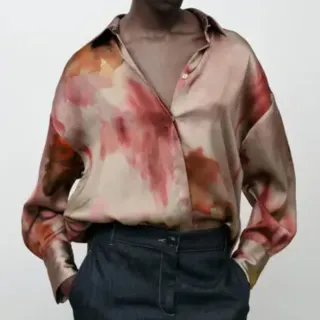Elegante blusa de satén con un diseño abstracto inspirado en acuarelas. Su tejido fluido y el estampado vibrante la hacen perfecta para destacar. - Material: Satén - Estampado: Acuarela multicolor