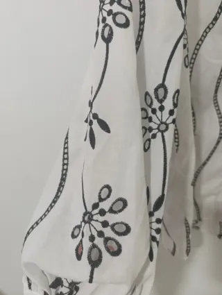 Elegante blusa negra con manga larga y un diseño texturizado que le da un toque especial. Los puños cuentan con un intrincado bordado en tonos dorados y plateados, añadiendo un detalle sofisticado. - Manga larga. - Puños con bordado ornamental.