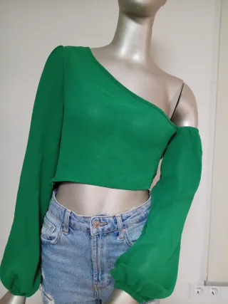 Elegante blusa crop top con un diseño moderno de hombro descubierto. Su vibrante color verde la hace destacar. - Manga larga abullonada. - Corte asimétrico. - Tejido ligero y fluido. - Cremallera en el Lateral.