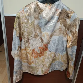 Elegante blusa de mujer con manga larga y un llamativo estampado. Prácticamente nueva, ha tenido muy poco uso - Diseño con estampado abstracto en tonos beige y marrón. - Manga larga. - Cuello redondo. NO se incluyen los accesorios