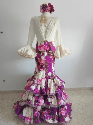 Traje de flamenca con un diseño vibrante y elegante, perfecto para ferias. - Cuerpo de gasa de plumeti con un tono beige tostado. Muy fresquito. - Falda larga con un buen tejido de estampado que se ajusta al cuerpo muy bien. Abierta en el centro, simulando una falda abotonada, completamente forrada con buena terminación para cuando se abra al andar. Cancán escondido - Detalle de botones preciosos, que le aportan un toque especial, muy fino. - Escote de pico pronunciado, fruncido en el centro hasta la cintura, para dar un falso efecto de que el escote es más pronunciado de lo real. - Tonos morado/buganvilla con beis tostados.