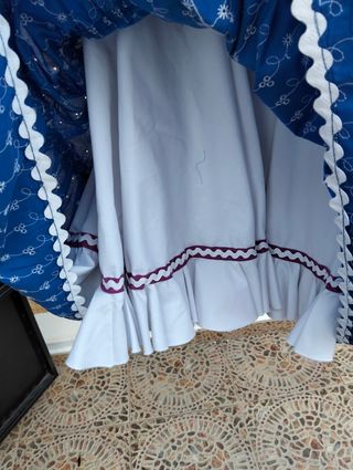 Falda de flamenca con un estampado vibrante y detalles encantadores. - Diseño de volantes con puntilla blanca. - Estampado floral multicolor sobre fondo blanco. - Base azul con delicados motivos florales blancos.Esta compuesto por falda y blusa .Tiene enaguas echas a mano.