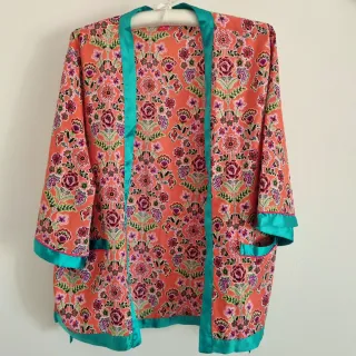 Kimono corto con un vibrante estampado floral. El diseño presenta detalles en contraste color Verde agua que le dan un toque único. - Diseño de flores en tonos coral, verde, morado y fucsia - Ribete y bolsillos en color verde. - Corte kimono abierto y manga ancha 3/4