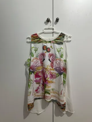 Blusa sin mangas con un estampado vibrante de flamencos y orquídeas. El diseño es llamativo y colorido, con detalles que le dan un toque único. - Estampado frontal de flamencos y flores. - Diseño sin mangas. - Acabado asimétrico en el bajo.