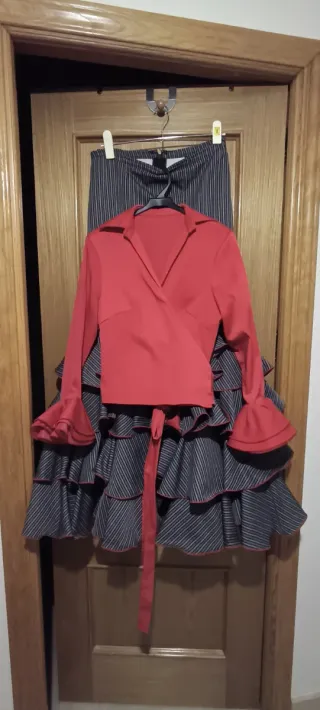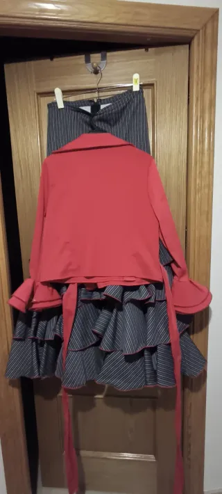 Conjunto de dos piezas para flamenca o baile. - Blusa de manga larga con volantes en color rojo. - Falda larga de rayas grises y rojas con volantes. - Tiene bolsillo con cremallera interior. - En uno de los volantes se ha ido un poco el cordoncillo, pero es de fácil solución.
