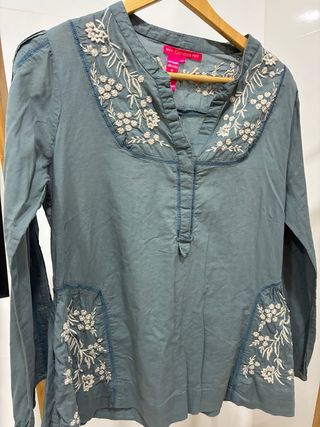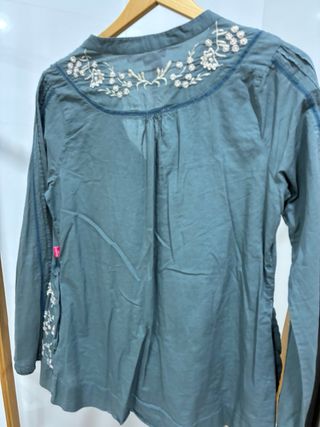 Blusa de manga larga con un diseño elegante y detalles bordados. - Cuello redondo con abertura. - Bordados florales en el cuello y bolsillos. - Mangas largas con hombros ligeramente fruncidos. - Dos bolsillos en la parte delantera inferior.