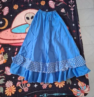 Falda flamenca con un diseño de lunares en tonos azules y blanco. Presenta volantes en cascada que le dan mucho movimiento. Cintura 64, cadera 94, largo 104. - Diseño de lunares grandes y pequeños. - Múltiples volantes en la parte inferior. - Combina blanco con azul marino, azulina y celeste. Cuerpo y blusa en mi perfil.