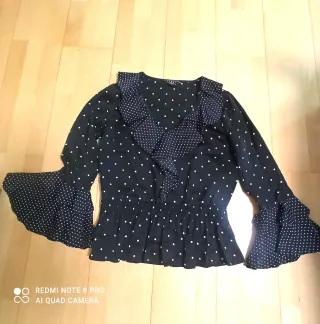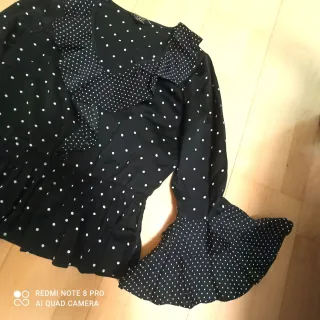 Conjunto de falda flamenca a lunares y blusa blanca. - Falda larga con volantes. - Blusa con cuello y puños fruncidos. Un uso. Comprado el abril 2025. Acabado impecable, costuras perfectas. Muy cómodo.
