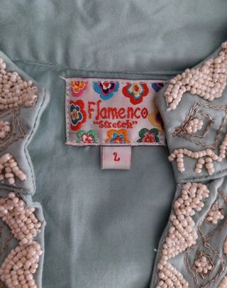 blusa / camisa marca Flamenco Talla L, yo gasto talla M y me va buen Esta toda bordada de piedrecitas, faltan algunas, se ve en la foto, pero una vez puesta no se aprecia. Tengo más en mi perfil HAGO ENVIOS
