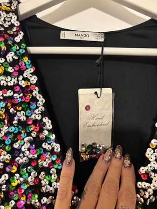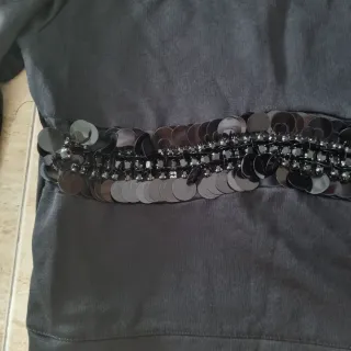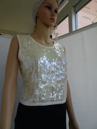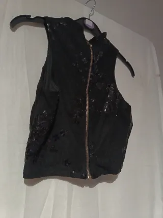 Elegante blusa sin mangas con detalles de bordados y lentejuelas también en negro. Pone talla 42 pero talla como una 40 - Escote en pico. - Entallada en cintura
