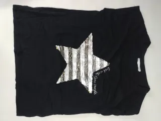 Blusa negra con un diseño llamativo de estrella. - Estrella central con lentejuelas doradas. - Detalle de texto Look at the Stars tonight.