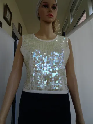Blusa sin mangas con un diseño brillante y llamativo. - Parte frontal cubierta de lentejuelas. - Acabado con borde inferior blanco.