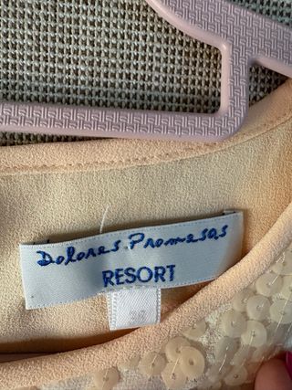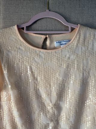 Elegante top de lentejuelas de Dolores Promesas, con cuello redondo y manga corta Color salmón muy bonito Lleva un pequeño enganche, que apenas se ve, lo puedes ver en las fotos