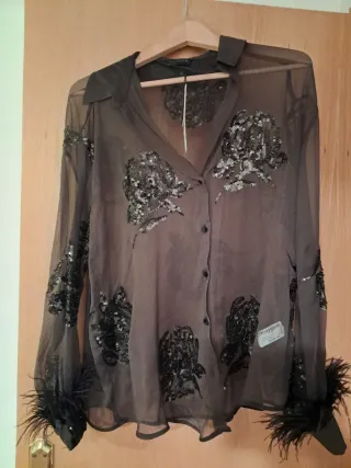 Blusa semitransparente con detalles de lentejuelas y plumas de Zara de la Talla L y de color marrón sin estrenar y con etiqueta. - Diseño floral con lentejuelas. - Mangas largas con adornos de plumas. - Cierre de botones. AGOTADA EN TIENDA